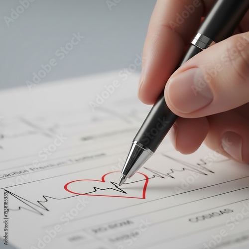 Close-up of a cardiologist’s pen writing a heart shape on a medical chart, with detailed textures. Represents precision for World Cardiologist Day, perfect for healthcare visuals.