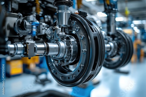 Close-up of a car's braking system assembly. Illustrates automotive engineering and manufacturing.