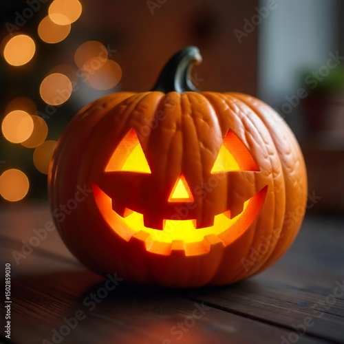 Close-up of a carved jack-o'-lantern pumpkin, with warm bokeh lights of fairy lights in the background, creating a festive Halloween mood. On a dark wooden surface. Halloween theme.