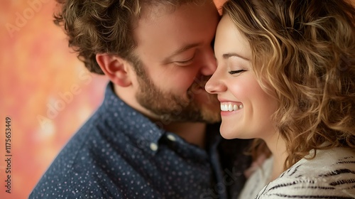 Close-up of a Caucasian couple smiling and kissing in a tender moment, set against a coral studio background, capturing the essence of love and romance