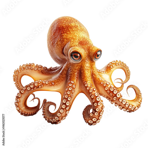Close-up of a cephalopod, orange-brown in color. Detailed tentacles and eyes