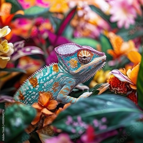 Close-Up of a Chameleon Blending into a Vibrant Background of Leaves and Flowers
