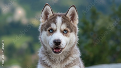 Close-up of a charming husky with striking blue eyes outside