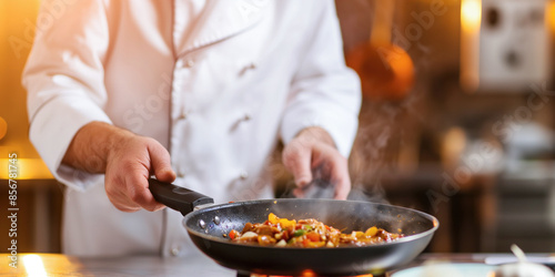 Close-up of a chef in a white coat holding a frying pan with vegetables being sautéed, steam rising from the pan, in a professional kitchen setting.