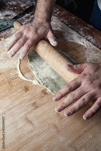 Close-up of a chef's hands rolling out dough with a rolling pin.