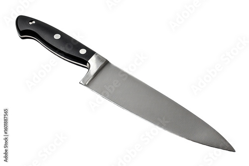 Close-up of a chef's knife. Black handle, stainless steel blade