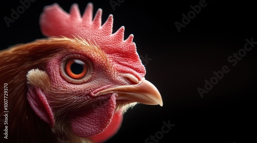Close-up of a chicken's head with vibrant colors against a dark background.