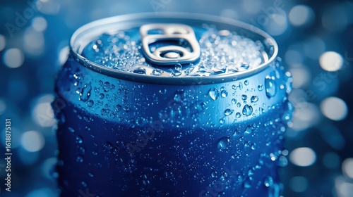 Close-Up of a Chilled Soda Can with Water Drops and Blue Background