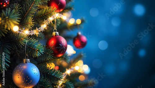 Close-up of a Christmas tree decorated with beautiful ornaments and glowing lights, on a colorful background. A festive christmas atmosphere.