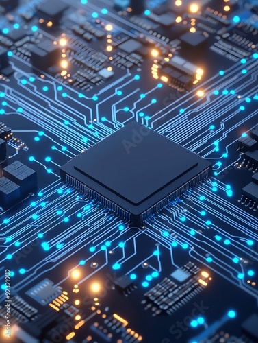 Close-up of a circuit board showcasing intricate electronic components and glowing connections, symbolizing technology and innovation.