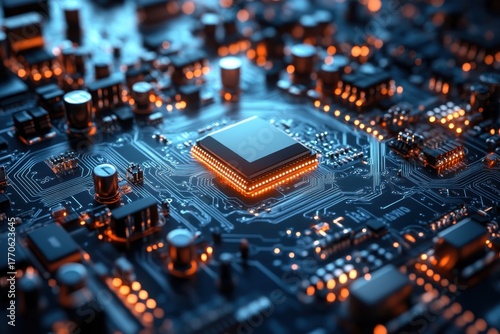 Close-up of a circuit board with a central processor and illuminated components in low light