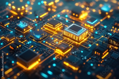 Close-up of a circuit board with glowing chips and wires.