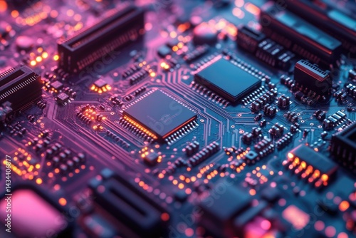Close-up of a circuit board with illuminated components, showcasing intricate electronic design and technology.