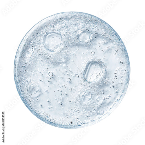 Close-up of a clear, gel-like substance in a petri dish. Circular, translucent, and bubbly texture