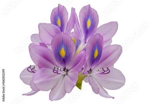 Close-up of a cluster of delicate, light purple flowers with striking yellow accents against a black background.