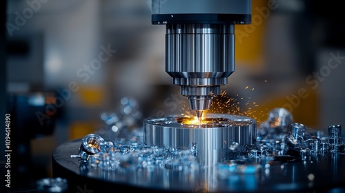 Close-up of a CNC machine drilling a metal workpiece, sparks flying