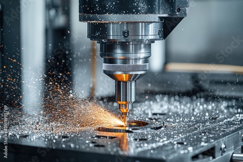 Close-up of a CNC milling machine cutting a metal workpiece with bright orange sparks flying around, illustrating industrial precision and dynamic motion