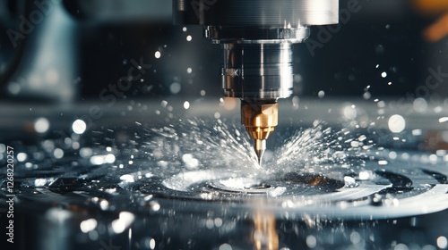 Close-up of a CNC water jet cutting through metal, showcasing precision and technology in industrial machining.
