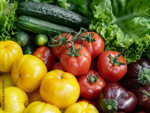 Close-up of a colorful assortment of vegetables, including tomatoes, cucumbers, and lettuce, arranged in a fresh and appetizing display