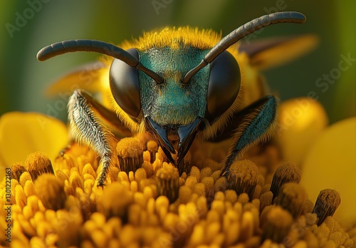 Close-up of a colorful bee resting on a vibrant yellow flower capturing intricate details of nature's pollinator in a stunning macro photography composition
