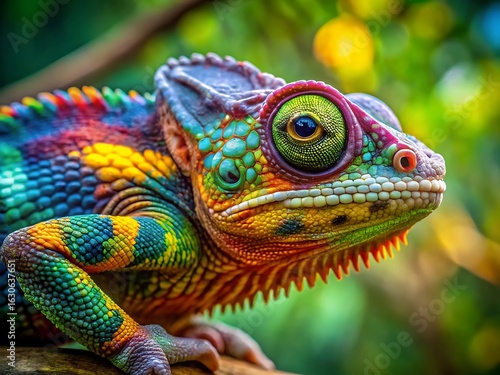 Closeup of a colorful chameleon with vibrant skin, showcasing its unique adaptation in nature