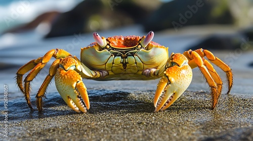 Close-up of a colorful crab on a rocky shore.