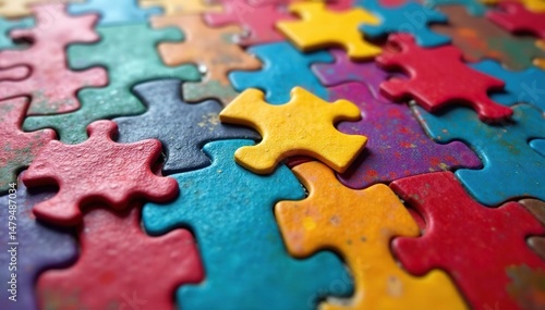 Close-up of a colorful jigsaw puzzle, pieces interlocked, forming a vibrant image , completion, focus, close-up