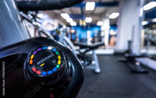 Close-up of a colorful resistance knob on an exercise machine in a gym.