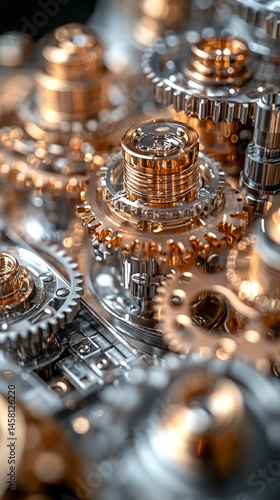 Close-up of a complex clockwork mechanism with interlocking gears and polished metallic components in golden and silver tones, symbolizing precision, time, unity, and engineered harmony.
