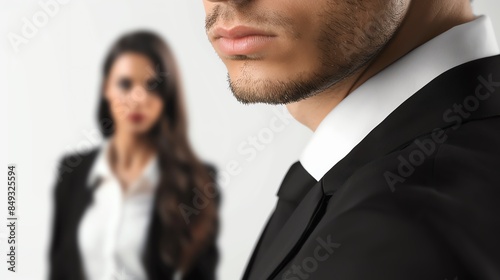 Close-up of a confident man in a suit with a businesswoman in the background. Professional and focused. Business attire and serious expressions.