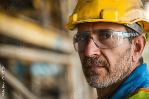 Close-up of a construction worker with a yellow helmet and safety glasses. He looks serious and professional on the job site.