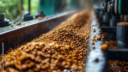 Close-up of a conveyor belt carrying a stream of small brown pellets in a manufacturing plant.
