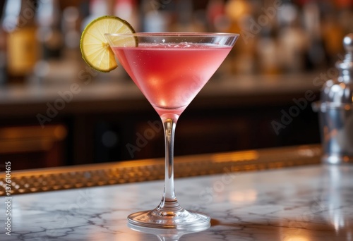 Close-up of a Cosmopolitan cocktail in an elegant martini glass in a bright pink hue, garnished with a fresh lime wedge