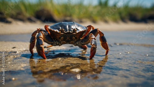 Close-up of a crab’s pincers and legs interacting with a small shell, showcasing its feeding behavior