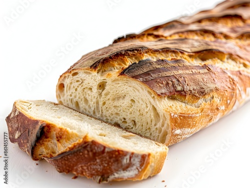 Closeup of a Crusty Baguette with Soft Airy Interior on White Background