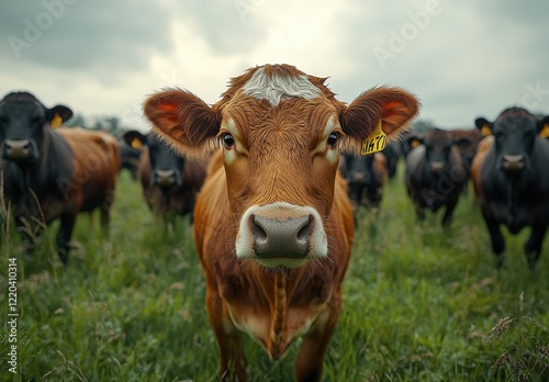 Close-Up of a Curious Brown Cow Surrounded by a Herd in a Grassy Field Under a Moody Sky, Perfect for Capturing Livestock and Rural Life Themes