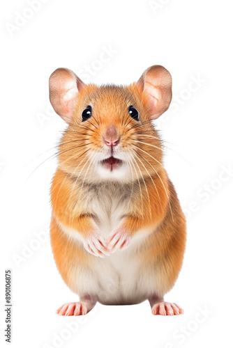 Close-up of a cute brown hamster standing on hind legs isolated on a white background, looking directly at the camera, adorable pet rodent.