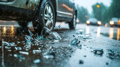 Close-up of a damaged car bumper with shattered glass on a wet road, depicting a car accident scene. Concept of vehicle collision, road safety, and emergency situations