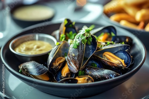 Close-up of a dark gray bowl filled with cooked mussels, garnished with parsley. A small bowl of light yellow sauce is also present