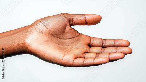 Close-up of a dark-brown hand, fingers slightly apart, palm open in a gesture of giving, receiving, or offering help. A poignant image of human connection and empathy.