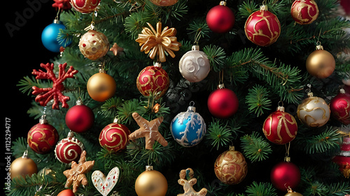 Close-up of a decorated Christmas tree with red, gold, blue, and silver ornaments.