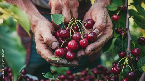 Close-up of a Dedicated Farmer Harvesting Fresh Cherries, Organic Farming and Harvesting Process, Sustainable Agriculture Concept.