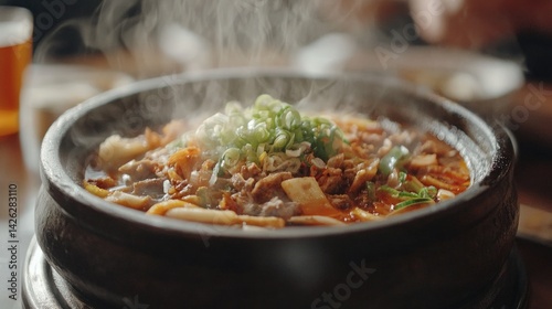 Close-up of a deep clay pot filled with steaming Chanko Nabe, vibrant ingredients arranged in layers