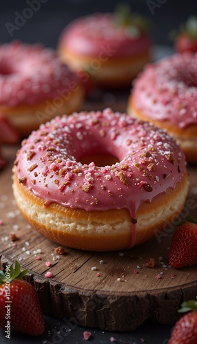 Close-up of a delectable strawberry glazed donut sprinkled with crunchy bits, beautifully presented on a rustic wooden board along with fresh strawberries.