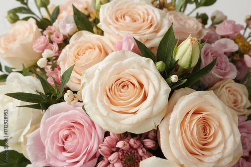 Close-up of a delicate bouquet featuring pale roses and eustoma. Mother's Day message. Vibrant arrangement with soft blossoms. Greeting card, heartfelt wishes theme.