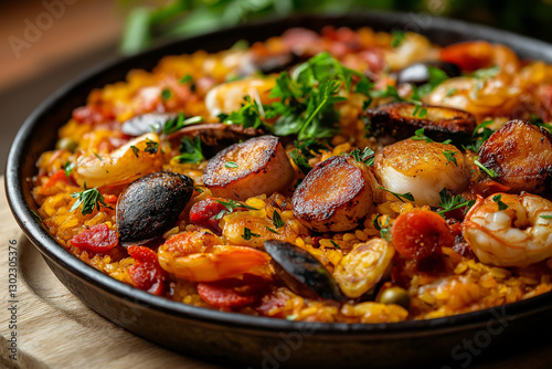 Close-up of a delicious Paella (A Spanish rice dish cooked with saffron, seafood, meat, and vegetables.)