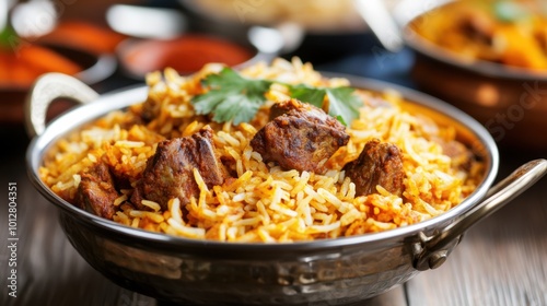 Closeup of a delicious biriyani served in a traditional metal bowl, the layers of rice and meat glistening with spices. The scene is set with a colorful Indian table setting.