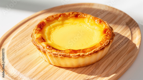 Close-up of a delicious custard tart on a wooden serving board, showcasing its golden crust and creamy filling under natural light.