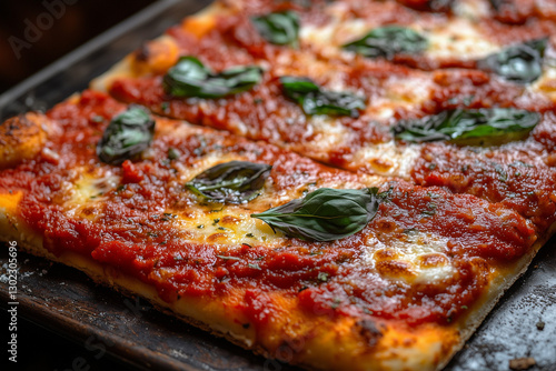 Close-up of a delicious Pizza (A flat, open-faced baked pie of Italian origin, topped with tomato sauce, cheese, and various toppings.)