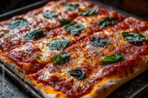 Close-up of a delicious Pizza (A flat, open-faced baked pie of Italian origin, topped with tomato sauce, cheese, and various toppings.)